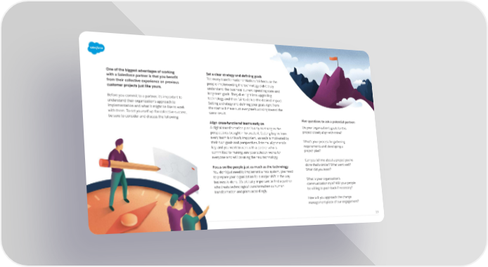 One of the biggest advantages of working with a Salesforce partner is that you benefit from their collective experience on previous customer projects just like yours. Before you commit to a partner, it’s important to understand their organization’s approach to implementation and what it might be like to work with them. To set yourself up for collective success, be sure to consider and discuss the following: Set a clear strategy and defining goals Too many transformation initiatives fail because the people implementing the technology didn’t truly understand the business’ current operating state and long-term goals. They dive right into upgrading technology and then fail to deliver the desired impact. Setting a strategy and defining your goals right from the start will make sure everyone’s working toward the same result. Align cross-functional teams early on A digital transformation plan is only as strong as the perspectives brought in to create it. Getting buy-in from every team is critically important, as each is motivated by their own goals and perspectives. Internal alignment is key, and you want to work with a partner who is committed to making sure your solution works for everyone who will be using the new technology. Focus on the people just as much as the technology You don’t just need to implement a new system, you need to prepare your organization for a major shift in the way business is done. It’s critically important to find a partner who treats technological transformation as human transformation and plans accordingly. Five questions to ask a potential partner: Do your organization’s goals for this project closely align with mine? What’s your process for gathering requirements and developing a project plan? Can you tell me about a project you’ve done that’s similar? What went well? What did you learn? What is your organization’s communication style? Will your people be willing to push back if necessary? How will you approach the change management piece of our engagement? 19