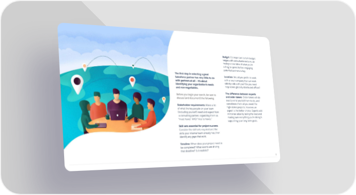 Budget : It’s important to talk budget ranges with consultants early on, so having a clear idea of what you’re willing to spend before engaging potential partners is key. Location: Would you prefer to work with a local company that can work side-by-side with you? Do you need help across globally distributed offices? The difference between experts and order takers : Order takers will do exactly what you tell them to do, and sometimes that’s all you need. For high-stakes projects, however, an expert is the better choice. Experts add immense value by taking the lead and making sure everything you’re doing is supporting your long-term goals. The first step in selecting a great Salesforce partner has very little to do with partners at all – it’s about identifying your organization’s needs and non-negotiables. Before you begin your search, be sure to discuss (and document) the following: Stakeholder requirements: Make a list of what the key people on your team (including yourself) need and expect from a consulting partner, organizing them as “must-haves” AND “nice-to-haves.” Skill sets essential for project success: Consider the skill sets required and the skills your internal team already has; then identify any gaps that exist. Timeline: When does your project need to be completed? What events are driving that deadline? Is it realistic? 9