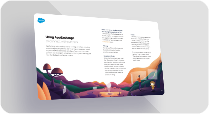 AppExchange is the marketplace for all things Salesforce, including apps, third-party integrations, and more. It gives you access to over 65,000 Salesforce-accredited consultants from more than 1,500 partners and developers, with advanced filtering tools that help you find the ideal partners for your projects. Using AppExchange to connect with partners. The first step in selecting a great Salesforce partner has very little to do with partners at all – it’s about identifying your organization’s needs and non-negotiables. Before you begin your search, be sure to discuss (and document) the following: Stakeholder requirements: Make a list of what the key people on your team (including yourself) need and expect from a consulting partner, organizing them as “must-haves” AND “nice-to-haves.” Skill sets essential for project success: Consider the skill sets required and the skills your internal team already has; then identify any gaps that exist. Timeline: When does your project need to be completed? What events are driving that deadline? Is it realistic? Here’s how to use AppExchange to find the right consultants for you. Consultants on AppExchange can be found using the top navigation bar in the AppExchange header. Under the “Consultants” tab, navigate to the Consultants page. Filtering You can use filters to find partners by product, industry, location, practice size, and ratings. Consultant Finder Within the Consultants page, you’ll find “Consultant Finder” — a guided search engine that helps you narrow down your search by even more specific criteria, such as preferred location, company size, and product and industry expertise. You can further filter searches based on consultant rating. Search One of the most popular ways to find information on AppExchange is to use the search bar at the top. The search functionality includes fuzzy matching and recommendations based on other searches, making it easy and fast to find consultants. Once the cumulative search results load, you’ll see a section called “Consultants,” which lists all of the relevant partners based on your search query. 10