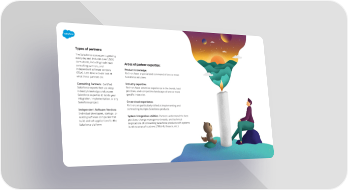 The Salesforce ecosystem is growing every day and includes over 1,500 consultants, including traditional consulting partners, and independent software vendors (ISVs). Let’s take a closer look at what these partners do: Consulting Partners: Certified Salesforce experts that use deep industry knowledge and proven Salesforce expertise to tackle your integration, implementation, or any Salesforce project Independent Software Vendors: Individual developers, startups, or existing software companies that build and sell applications for the Salesforce platform Strategizing and executing on functionality and integration requirements Determining a Salesforce solution that works with your business processes Developing, managing, and tracking project plans Tailoring the solution to meet your specific needs Identifying opportunities to drive efficiency and growth using Salesforce Investigating possible add-ons and integrations Ensuring the project is completed on time and on budget Areas of partner expertise: Types of partners: Product knowledge: Partners have a specialized command of one or more Salesforce solutions Industry expertise: Partners have extensive experience in the trends, best practices, and competitive landscape of one or more specific industries Cross-cloud experience: Partners are particularly skilled at implementing and connecting multiple Salesforce products System Integration abilities : Partners understand the best practices, change management needs, and technical implications of connecting Salesforce products with systems in other areas of business (ERP, HR, finance, etc.) 7