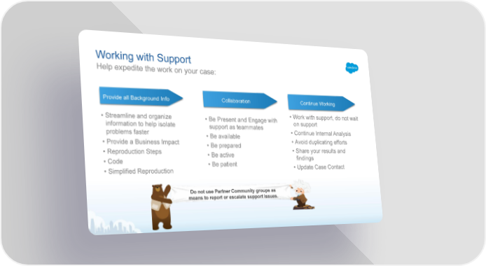 Working with Support Help expedite the work on your case: Collaboration Continue Working Provide all Background Info • Work with support, do not wait • Streamline and organize • Be Present and Engage with on support information to help isolate support as teammates • Continue Internal Analysis problems faster • Be available • Avoid duplicating efforts • Provide a Business Impact • Be prepared • Share your results and • Reproduction Steps • Be active findings • Code • Be patient • Update Case Contact • Simplified Reproduction Do not use Partner Community groups as means to report or escalate support issues.
