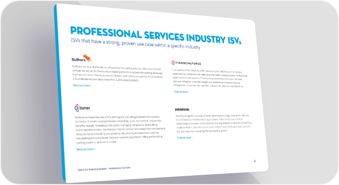 Professional Services Industry ISVs ISVs that have a strong, proven use case within a specific industry Bullhorn® is the global leader in software for the staffing industry. More than 11,000 FinancialForce PSA Cloud and ERP Cloud are specifically designed for Services companies rely on Bullhorn’s cloud-based platforms to power their staffing processes organisations. Combined with Salesforce they deliver a single solution for the whole from start to finish. Headquartered in Boston, with offices around the world, Bullhorn opportunity-to-cash process. This ensures project delivery success, optimises is founder-led and employs more than 1,200 people globally. resource utilisation, improves margins and streamlines billing and revenue Find out more > management. Customers include DXC, Amazon, JLL, Methods and Salesforce. Find out more > Byner automates the core of the staffing and consulting business from contract Recently recognised as a top 10 fastest growing technology company in Deloitte’s to invoice. It creates synergy between marketing, sales, recruitment, and delivery. Fast 50 Awards, Introhive helps organisations realise the full value of their Benefits include increasing productivity, managing compliance, and building relationships and under-utilised data. By ensuring adoption at all levels of Salesforce blooming relationships. Key features include contract and assignment management, implementation, Introhive ensures users fully embrace CRM and keeps data clean resource request handling and planning, document generation and e-signing, and accurate, thus increasing ROI and pipeline growth. onboarding and compliance, time and expense registration, billing and invoicing, Find out more > staffing analytics, and communities. Find out more > EMEA ISV Industry Booklet – Professional Services 44
