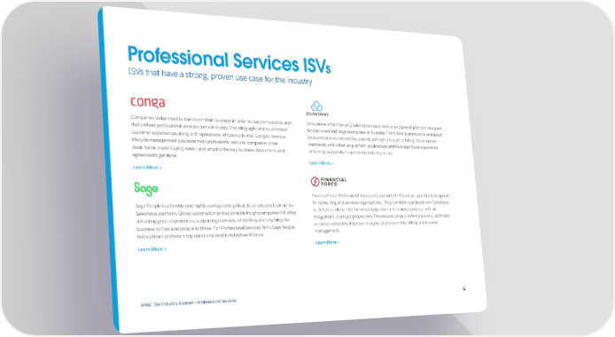 Professional Services ISVs ISVs that have a strong, proven use case for the industry Companies today need to transform their business in order to stay competitive, and 2cloudnine offers the only Salesforce native, end-to-end payroll platform designed that’s where professional services come into play. Providing agile and customized for mid-sized and large enterprises in Australia. From time & attendance and award customer experiences along with operational efficiency is vital. Conga’s revenue interpretation to onboarding, payroll, and right through to billing. We integrate lifecycle management solutions help professional services companies close seamlessly with other on-platform applications and have significant experience deals faster, make buying easier, and simplify the way business documents and delivering our products across this industry sector. agreements get done. Learn More > Learn More > FinancialForce Professional Services Cloud and ERP Cloud are specifically designed Sage People is a flexible and highly-configurable global cloud solution built on the for consulting and services organizations. They combine seamlessly with Salesforce Salesforce platform. Global automation and actionable insights empower HR while to deliver a solution for the whole opportunity-to-renewal process, with no delivering great experiences, supporting new ways of working and enabling the integrations, a unique proposition. This ensures project delivery success, optimizes business to flow and people to thrive. For Professional Services firms Sage People resource utilization, improves margins, and streamlines billing and revenue helps attract and retain top talent and enable hybrid workforces. management. Learn More > Learn More > APAC ISV Industry Booklet — Professional Services 4