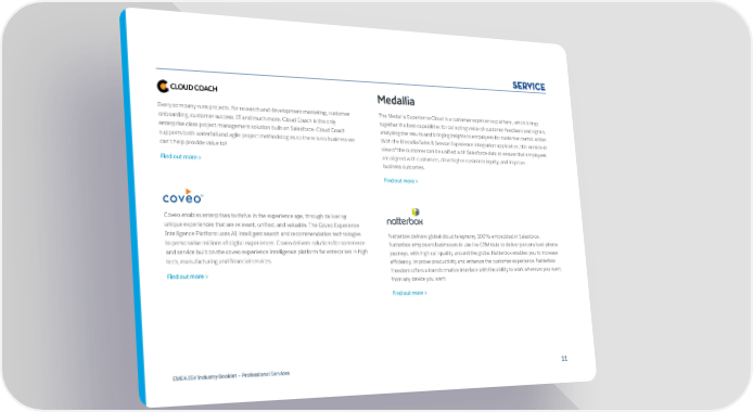 Service Every company runs projects, for research and development marketing, customer The Medallia Experience Cloud is a customer experience platform, which brings onboarding, customer success, IT and much more. Cloud Coach is the only together the best capabilities for collecting voice-of-customer feedback and signals, enterprise class project management solution built on Salesforce. Cloud Coach analysing the results and bringing insights to employees for customer-centric action. supports both waterfall and agile project methodologies so there is no business we With the Medallia Sales & Service Experience integration application, this outside-in can’t help provide value to! view of the customer can be unified with Salesforce data to ensure that employees are aligned with customers, drive higher customer loyalty, and improve Find out more > business outcomes. Find out more > Coveo enables enterprises to thrive in the experience age, through delivering unique experiences that are relevant, unified, and valuable. The Coveo Experience Intelligence Platform uses AI, intelligent search and recommendation technologies Natterbox delivers global cloud telephony, 100% embedded in Salesforce. to personalise millions of digital experiences. Coveo delivers solutions for commerce Natterbox empowers businesses to use live CRM data to deliver personalised phone and service built on the coveo experience intelligence platform for enterprises in high journeys, with high call quality, around the globe. Natterbox enables you to increase tech, manufacturing and financial services. efficiency, improve productivity and enhance the customer experience. Natterbox Find out more > Freedom offers a transformative interface with the ability to work wherever you want, from any device you want. Find out more > EMEA ISV Industry Booklet – Professional Services 1111