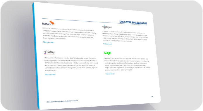 Employee Engagement Bullhorn for Salesforce is a comprehensive recruitment application built on the force. m | ployee is a solution for the staffing and professional service industry on the com platform supporting the sales, recruiting, and operational processes within staffing Salesforce platform. You can implement m|ployee as a stand-alone solution or as an agencies. Used by some of the largest agencies in the world, Bullhorn for Salesforce add-on to one of the Salesforce Clouds. Manage candidates, time, contracts, finance accelerates the adoption and usage of the core Salesforce services including Sales and talent all in one place. One single point of truth and 100% control of time and Cloud, Marketing Cloud, and others. resources. Your flows, your processes, your business. Find out more > Find out more > HR2day is the HR and payroll cloud solution for today and tomorrow. The vision is Sage People provides an end-to-end HR solution on the Salesforce platform. Sage to help organisations optimise their HR and payroll processes by using HR2days — a Intacct is the world’s largest global pure-play financial management provider, with 100% native Salesforce cloud application. HR2day is available for the Dutch market excellent integration into Salesforce. Both products have 5-star AppExchange and focuses on 250+ employee organisations. The functional scope covers HR reviews. Sage Intacct and People help finance and HR professionals manage administration, self service, talent management, payroll, leave, sickleave, expenses insights to help their organisations analyse, strategise, and anticipate. They integrate and HR analytics. processes and procedures, delivering strong ROI Find out more > Find out more > EMEA ISV Industry Booklet – Professional Services 1515