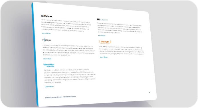 Recommended by global leaders in consulting, software, and hi-tech, Kimble is Precursive helps forward-thinking companies to see success faster. Founded in 2011 the only leading software vendor that focuses exclusively on professional services and headquartered in London, the app is 100% native to Salesforce and enables automation. Kimble helps businesses, from sales, to project management, to growth through improved customer onboarding and capacity planning. Precursive finance, connect on what to prioritise – increasing customer satisfaction and serves both mid-market businesses and large enterprises in business services as well optimising resource utilisation, profitability, and business scalability. as comms, media, and high tech sectors. Learn More > Learn More > m|ployee is the solution for the staffing and professional services industry on the Sirenum helps organisations transform their business operations by streamlining Salesforce platform. You can implement m|ployee stand-alone or as an add-on to the management of their shift workers, saving costs, reducing risk, and increasing one of the Salesforce Clouds, manage candidates, time, contracts, finance and talent revenue. Our Salesforce-native software enables management to save valuable time all in one place. One Single Point of Truth and 100% control of time and resources. in scheduling shifts, managing compliance, monitoring staff, and processing payroll. Your flows, your processes, your business. Learn More > Learn More > Mysolution recruitment is a recruitment solution built on the Salesforce platform. It provides extensive Applicant Tracking System(ATS) functionality for recruitment including CV parsing, matching, application processes. It also provides mid-office functionality for employment contracts and document generation and signing. It is seamlessly integrated with standard Salesforce CRM, service and marketing functionalities. Learn More > EMEA ISV Industry Booklet — Professional Services 5