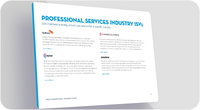 Professional Services INDUSTRY ISVs ISVs that have a strong, proven use case within a specific industry Bullhorn® is the global leader in software for the staffing industry. More than FinancialForce PSA Cloud and ERP Cloud are specifically designed for Services 11,000 companies rely on Bullhorn’s cloud-based platforms to power their staffing organisations. Combined with Salesforce they deliver a single solution for the whole processes from start to finish. Headquartered in Boston, with offices around the opportunity-to-cash process. This ensures project delivery success, optimises world, Bullhorn is founder-led and employs more than 1,200 people globally. resource utilisation, improves margins and streamlines billing and revenue management. Customers include DXC, Amazon, JLL, Methods and Salesforce. Learn More > Learn More > Byner automates the core of the staffing and consulting business from contract Recently recognised as a top 10 fastest growing technology company in Deloitte’s to invoice. It creates synergy between marketing, sales, recruitment, and delivery. Fast 50 Awards, Introhive helps organisations realise the full value of their Benefits include increasing productivity, managing compliance, and building relationships and under-utilised data. By ensuring adoption at all levels of Salesforce blooming relationships. Key features include contract and assignment management, implementation, Introhive ensures users fully embrace CRM and keeps data clean resource request handling and planning, document generation and e-signing, and accurate, thus increasing ROI and pipeline growth. onboarding and compliance, time and expense registration, billing and invoicing, Learn More > staffing analytics, and communities. Learn More > EMEA ISV Industry Booklet — Professional Services 4