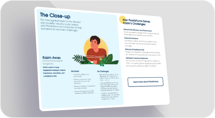How ProntoForms Solves The Close-up Kazim’s Challenges See how a global leader in the elevator and escalator industry could partner Gained Field Efficiency and Performance with ProntoForms to modernize its field Technicians saved an average of 90 minutes per day and operations to overcome challenges. reduced their administrative burden by 89%. Improved Handover A smoother handover at the branch and technician levels eliminates days and weeks of administration overheads. Reduced Compliance Cost GoingUp Inc. was able to reduce fixed costs by $5,000 per month by limiting compliance follow-ups with TSSA. Kazim Awan Delivered Customer Satisfaction Field Service Director/VP Kazim’s teams are now utilizing customer satisfaction GoingUp Inc. (CSAT) forms and customer acceptance reports (CAPs) to track service quality and customer feedback. Kazim needs to keep equipment running to reduce His Goals: His Challenges: breakdown, downtime, and compliance risks. • Streamline workflows and • Slow, paper-based process for the reduce errors PM program from inspection to • Efficiently capture and share audit to follow-ups. Human errors critical information to field reduce accuracy. technicians • Evidence gathering for warranty, Learn more about ProntoForms • Maintain compliance requirements parts order, repair, and return of and safety standards equipment; identifying critical safety issues; getting customer • Improve the experience of both approvals; and more was difficult. customers and field technicians • Compliance requirements for multiple jurisdictional authorities, such as federal, provincial, and municipal, are complex.