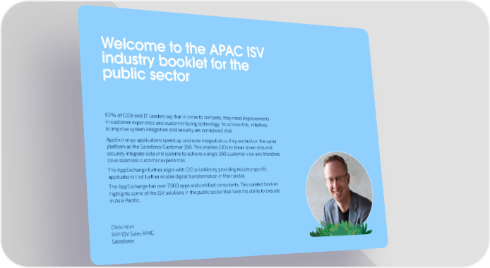 Welcome to the APAC ISV industry booklet for the public sector 93% of CIOs and IT Leaders say that in order to compete, they need improvements in customer experience and customer-facing technology. To achieve this, initiatives to improve system integration and security are considered vital. AppExchange applications speed up and ease integration as they are built on the same platform as the Salesforce Customer 360. This enables CIOs to break down silos and securely integrate data and systems to achieve a single 360 customer view and therefore drive seamless customer experiences. The AppExchange further aligns with CIO priorities by providing industry-specific applications that further enable digital transformation in their sector. The AppExchange has over 7,000 apps and certified consultants. This curated booklet highlights some of the ISV solutions in the public sector that have the ability to execute in Asia Pacific. Chris Horn RVP ISV Sales APAC Salesforce