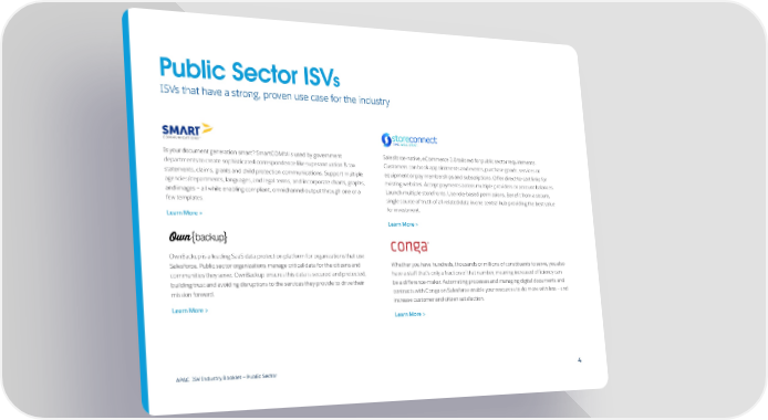 Public Sector ISVs ISVs that have a strong, proven use case for the industry Is your document generation smart? SmartCOMM is used by government Salesforce-native, eCommerce 3.0 tailored for public sector requirements. departments to create sophisticated correspondence like superannuation & tax Customers can book appointments and events, purchase goods, services or statements, claims, grants and child protection communications. Support multiple equipment or pay memberships and subscriptions. Offer direct-to-cart links for agencies/departments, languages, and legal terms, and incorporate charts, graphs, existing websites. Accept payments across multiple providers or account balances. and images – all while enabling compliant, omnichannel output through one or a Launch multiple storefronts. Use role-based permissions. Benefit from a secure, few templates. single source of truth of all related data in one central hub providing the best value for investment. Learn More > Learn More > OwnBackup is a leading SaaS data protection platform for organizations that use Salesforce. Public sector organizations manage critical data for the citizens and Whether you have hundreds, thousands or millions of constituents to serve, you also communities they serve. OwnBackup ensures this data is secured and protected, have a staff that’s only a fraction of that number, meaning increased efficiency can building trust and avoiding disruptions to the services they provide to drive their be a difference-maker. Automating processes and managing digital documents and mission forward. contracts with Conga on Salesforce enable your resources to do more with less — and increase customer and citizen satisfaction. Learn More > Learn More > APAC ISV Industry Booklet — Public Sector 4