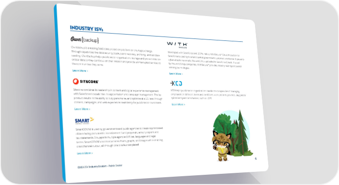 INDUSTRY ISVs OwnBackup is a leading SaaS data protection platform on the AppExchange. Developed with Salesforce and 100% native, WithSecure™ Cloud Protection for Through capabilities like data security, backup and recovery, archiving, and sandbox Salesforce is used by local and central government customers worldwide. It prevents seeding, OwnBackup helps public sector organisations manage and protect mission- cyber-attacks via emails, files and URLs uploaded to Salesforce Clouds. Trusted critical data so they can focus on their mission and provide uninterrupted services to by the world’s top companies, WithSecure™ provides industry-leading and award- the communities they serve. winning technologies. Learn More > Learn More > Sitecore combines its leadership in content and digital experience management XCD helps public sector organisations handle the complexities of managing with Salesforce’s capabilities in segmentation and campaign management. The by- employees on different terms and conditions, work patterns, job roles, pay grades/ product results in the ability to truly personalise, and optimise at a 1:1 level through spines and pension schemes, such as LGPS. content, campaigns, and web experiences seamlessly for public sector customers. Learn More > Learn More > SmartCOMM is used by governments and public agencies to create sophisticated citizen-facing documents like retirement fund proposals, annuity reports and tax statements. It supports multiple agencies/offices, languages and legal terms. SmartCOMM also incorporates charts, graphs, and images while enabling omnichannel output‚ all through one or a few templates! Learn More > EMEA ISV Industry Booklet — Public Sector 6