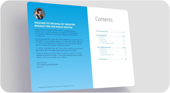 Contents WELCOME TO THE EMEA ISV INDUSTRY BOOKLET FOR THE PUBLIC SECTOR 93% of CIOs and IT Leaders say that in order to compete, they need 01. Public Sector ISVs . . . . . . . . . . . . . . . . . . . . . . . . . . 3–6 improvements in customer experience and customer facing technology.* To achieve this, initiatives to improve system integration and security are 02. Horizontal ISVs . . . . . . . . . . . . . . . . . . . . . . . . . . . 7–20 considered vital. Sales ISVs . . . . . . . . . . . . . . . . . . . . . . . . . . . . . . . . . . . .8 Service ISVs . . . . . . . . . . . . . . . . . . . . . . . . . . . . . . . . 13 AppExchange applications speed up and ease integration as they are built on the Marketing ISVs . . . . . . . . . . . . . . . . . . . . . . . . . . . . . .17 same platform as the Salesforce Customer 360. This enables CIOs to break down Employee Engagement ISVs . . . . . . . . . . . . . . . . . . .19 silos and securely integrate data and systems to achieve a single 360 customer view and therefore drive seamless customer experiences. 03. IT Infrastructure ISVs . . . . . . . . . . . . . . . . . . . . . 21–25 The AppExchange further aligns with CIO priorities by providing industry-specific Backup ISVs . . . . . . . . . . . . . . . . . . . . . . . . . . . . . . . . 22 applications that further enable digital transformation in their sector. DevOps ISVs . . . . . . . . . . . . . . . . . . . . . . . . . . . . . . . . 23 The AppExchange has over 7,000 apps and certified consultants. This booklet Security ISVs . . . . . . . . . . . . . . . . . . . . . . . . . . . . . . . 24 highlights some of the ISV solutions in the public sector that have the ability to Usage and Adoption ISVs . . . . . . . . . . . . . . . . . . . . 25 execute in EMEA (Europe, Middle East and Africa). 04. Get in touch . . . . . . . . . . . . . . . . . . . . . . . . . . . . . . . . 26 Virginia Matassa VP ISV Partner Sales EMEA & APAC Salesforce *Salesforce Research analysed survey responses from 100+ technology leaders worldwide