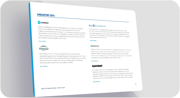 INDUSTRY ISVs Copado is a leading native DevOps & Testing platform for Salesforce. We enable Dun & Bradstreet is the leading, global business information provider and their faster, error-free digital cloud deployments and upgrades with continuous D-U-N-S® Number is the UK Government’s chosen unique identity data standard for integration and deployment technologies. All this is delivered via a native, enterprise- the Supplier Registration Service. D&B Connect for Salesforce enables Government class developer platform which is fully integrated with Salesforce DX and Salesforce departments to manage data and gain insight on entities of interest including global Clouds. Copado delivers the quality, speed and scale required by central and local trade development relationships. governments to meet the needs of their citizens. Learn More > Learn More > Odaseva provides data protection (backup, archiving), data privacy (user rights, data retention) and innovative data residency that allows constituent PII to be stored Drawbridge is the all-inclusive, pre-configured financial and transaction outside of Salesforce. Odaseva’s data governance platform is trusted by 100+ management app. Native on the Salesforce platform and purpose-built for Public million Salesforce Enterprise users from leading organisations such as Victoria State Sector Solutions (PSS), Drawbridge helps PSS users to manage the critical financial Government and the Washington DC Department of Health. workflows from within Salesforce including: cashiering, accounts receivable, Learn More > accounts payable, payments, and sub-ledger accounting. Learn More > As the public sector shifts to fully digital processes, OpenText has a range of integrated solutions for Salesforce to help digitize, manage and control your organisation’s electronic documents (including incoming paper!). Content solutions integrated to Salesforce solve a range of important use cases for citizens including mail room, archiving, records management and content-enabled service requests. Learn More > EMEA ISV Industry Booklet — Public Sector 5