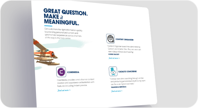 GREAT QUESTION. MAKE it MEANINGFUL. Get customers the right information quickly by providing personalized content and synchronized experiences across channels CONTENT ORGANIZER all the way to the help center. “Content Organizer saves time administrating Content and Chatter files. Plus, our users can view videos without downloading.” NORRIS MACKEY Find out more > COREMEDIA CADALYS CONCIERGE CoreMedia provides omni-channel content “Cadalys saves time searching through articles creation and experience orchestration with and producing personalized results so my team features including instant preview. can focus on higher-level tasks.” Find out more > FRANCESCA BERTUGLIA Find out more >