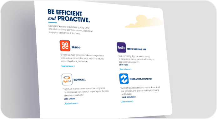 BE EFFICIENT and PROACTIVE. Easily process and ship orders quickly. Offer one-click tracking, seamless returns, and always keep your customers in the loop. BRINGG FEDEX SHIPPING APP Bringg is a next-generation delivery experience “FedEx Shipping App is a one-stop shop with a streamlined checkout, real-time tracker, to initiate and track shipments all the way to instant feedback, and more. their destination points.” Find out more > STEVE POON Find out more > SIGHTCALL ZENKRAFT MULTICARRIER “SightCall makes it easy to capture long serial “ZenKraft has saved time and hassle, streamlined numbers and run a search to pull up all the info our workflow, and given us visibility to shipping about our products.” and returns.” ALEX LEROUX DAVID DURANCEAU Find out more > Find out more >
