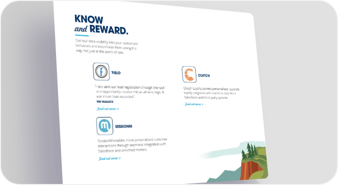KNOW and REWARD. Get real-time visibility into your customers' behaviors and incentivize them along the way, not just at the point of sale. FIELO CLUTCH “Fielo sent our lead registration through the roof Clutch Loyalty powers personalized, scalable and opportunity creation hit an all-time high. It loyalty programs with real-time data from was more than expected.” Salesforce and third-party systems. TIM WALLICK Find out more > Find out more > SESSIONM SessionM enables more personalized customer interactions through seamless integration with Salesforce and enriched metrics. Find out more >