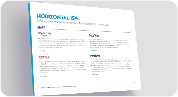 Horizontal ISvs ISVs that have a proven use case across multiple industries and business units Sales Beyond 19 enables its clients to embed the behaviours and best practices of high Automate and connect the entire agreement process with DocuSign. DocuSign performing salespeople to enhance productivity. Our suite of apps helps businesses Agreement Cloud for Salesforce helps organizations connect and automate how to achieve and exceed their revenue objectives, take a more strategic approach they prepare, sign, act on, and manage agreements — all integrated with Salesforce. to customers, increase share of wallet and win rates, and provide ‘next best steps’ With DocuSign, organizations can do business faster with less risk, lower costs, and through its Virtual Sales Coach features. better experiences for customers, partners, and employees. Learn More > Learn More > Introhive is proven to drive user adoption of Salesforce and increases sale efficiency, Conga helps Salesforce customers maximize their CRM investment. As the leader productivity, and outcomes. By enriching CRM data, the Introhive platform increases in Digital Document Transformation, Conga transforms the documents, contracts, the accuracy and completeness of your single source of truth, while delivering and processes that businesses use daily by leveraging the data within Salesforce. actionable relationship insights, where and when you need them. Introhive helps Conga empowers companies to create, negotiate, execute, and manage one of companies of all sizes and complexities gain a better understanding of the depth their most critical business assets: documents, so they focus on driving business and of relationships across their organizations, helping to accelerate deal velocity, delight revenue faster. customers, and increase client retention. Learn More > Learn More > EMEA ISV Industry Booklet — Retail & Consumer Packaged Goods 7