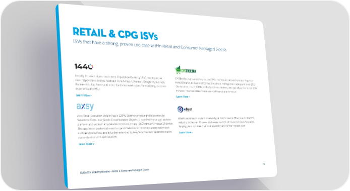 RETAIL & CPG ISvs ISVs that have a strong, proven use case within Retail and Consumer Packaged Goods Amplify the voice of your customers. Reputation Studio by 1440 enables you to CPGToolBox has successfully helped CPGs like PepsiCo, Abbott Nutrition, Popchips, view, respond and analyze feedback from Amazon, Walmart, Google My Business, PANOS Brands, La Colombe Coffee, and others, manage their trade spend since 2012. Bazaarvoice, App Stores and more. Customize workspaces for marketing, customer Our solution is built 100% on the Salesforce platform, and typically we realize a 5-10% experience and R&D. increase in our customers’ trade spend efficiency at a minimum. Learn More > Learn More > Axsy Retail Execution Mobile App is 100% Salesforce-native and is powered by Salesforce Consumer Goods Cloud Standard Objects. It is offline-first as well as cross- eBest specializes in route-to-market digital transformation IT services for the CPG platform and works in any network condition, on any iOS/Android/Windows 10 device. industry. In the past 20 years, we have served 70+ of the world’s top CPG brands, The app is easily extendable and supports Salesforce’s no-code customization tools helping them optimize their retail execution and further increase sales. such as Mobile Flow, and is further extended by Axsy’s own suite of Salesforce-native Learn More > customization tools and solutions. Learn More > EMEA ISV Industry Booklet — Retail & Consumer Packaged Goods 4