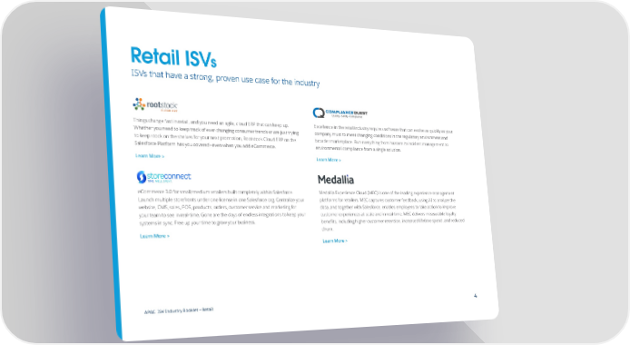 Retail ISVs ISVs that have a strong, proven use case for the industry Things change fast in retail, and you need an agile, cloud ERP that can keep up. Excellence in the retail industry requires software that can evolve as quickly as your Whether you need to keep track of ever-changing consumer trends or are just trying company must to meet changing conditions in the regulatory environment and to keep stock on the shelves for your next promotion, Rootstock Cloud ERP on the broader marketplace. Run everything from hazcom to incident management to Salesforce Platform has you covered—even when you add eCommerce. environmental compliance from a single solution. Learn More > Learn More > eCommerce 3.0 for small/medium retailers built completely within Salesforce. Medallia Experience Cloud (MEC) is one of the leading experience management Launch multiple storefronts under one license in one Salesforce org. Centralize your platforms for retailers. MEC captures customer feedback, using AI to analyze the website, CMS, sales, POS, products, orders, customer service and marketing for data, and together with Salesforce, enables employees to take action to improve your team to see in real-time. Gone are the days of endless integrations to keep your customer experiences at scale and in real-time. MEC delivers measurable loyalty systems in sync. Free up your time to grow your business. benefits, including higher customer retention, increased lifetime spend, and reduced churn. Learn More > Learn More > APAC ISV Industry Booklet — Retail 4