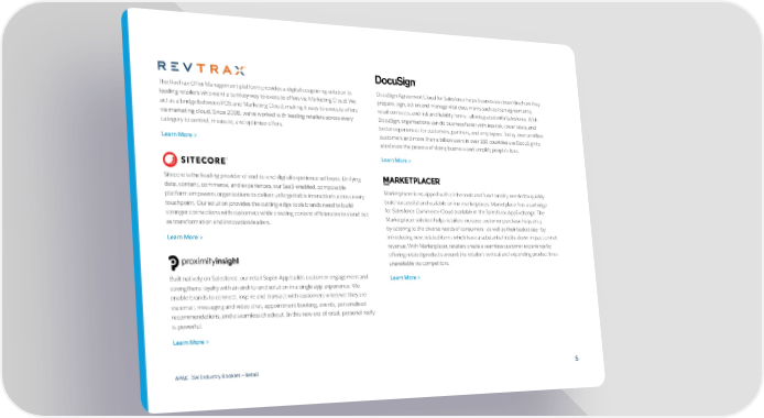 The RevTrax Offer Management platform provides a digital couponing solution to DocuSign Agreement Cloud for Salesforce helps businesses streamline how they leading retailers who want a turnkey way to execute offers via Marketing Cloud. We prepare, sign, act on and manage vital documents such as loan agreements, act as a bridge between POS and Marketing Cloud, making it easy to execute offers retail contracts, and risk and liability forms - all integrated with Salesforce. With via marketing cloud. Since 2008, we’ve worked with leading retailers across every DocuSign, organisations can do business faster with less risk, lower costs, and category to control, measure, and optimize offers. better experiences for customers, partners, and employees. Today, over a million customers and more than a billion users in over 180 countries use DocuSign to Learn More > accelerate the process of doing business and simplify people’s lives. Learn More > Sitecore is the leading provider of end-to-end digital experience software. Unifying data, content, commerce, and experiences, our SaaS-enabled, composable Marketplacer is equipped with all the tools and functionality needed to quickly platform empowers organizations to deliver unforgettable interactions across every build successful and scalable online marketplaces. Marketplacer has a cartridge touchpoint. Our solution provides the cutting-edge tools brands need to build for Salesforce Commerce Cloud available in the Salesforce AppExchange. The stronger connections with customers while creating content efficiencies to stand out Marketplacer solution helps retailers increase customer purchase frequency as transformation and innovation leaders. by catering to the diverse needs of consumers - as well as their basket size - by Learn More > introducing new, related items which have a substantial trickle-down impact on net revenue. With Marketplacer, retailers create a seamless customer experience by offering related products around the retailer’s vertical and expanding product lines unavailable via competitors. Built natively on Salesforce, our retail Super-App builds customer engagement and Learn More > strengthens loyalty with an end-to-end solution in a single app experience. We enable brands to connect, inspire and transact with customers wherever they are via email, messaging and video chat, appointment booking, events, personalised recommendations, and a seamless checkout. In this new era of retail, personal really is powerful. Learn More > APAC ISV Industry Booklet — Retail 5