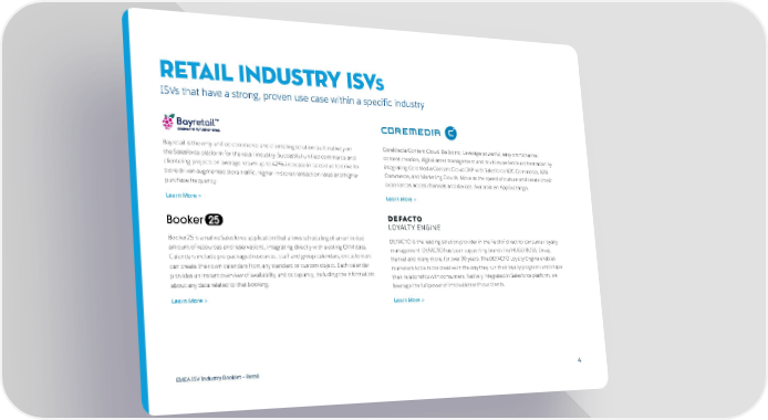 RETAIL INDUSTRY ISVs ISVs that have a strong, proven use case within a specific industry Bayretail is the only unified commerce and clienteling solution built natively on CoreMedia Content Cloud. Be Iconic. Leverage powerful, easy omnichannel the Salesforce platform for the retail industry. Successful unified commerce and content creation, digital asset management and multi-experience orchestration by clienteling projects on average return up to 42% increase in sales due to drive-to- integrating CoreMedia Content Cloud DXP with Salesforce B2C Commerce, B2B store driven augmented store traffic, higher in-store transaction rates and higher Commerce, and Marketing Clouds. Move at the speed of culture and create iconic purchase frequency. experiences across channels and devices. Available on AppExchange. Learn More > Learn More > Booker25 is a native Salesforce application that allows scheduling of an unlimited DEFACTO is the leading solution provider in the field of direct-to-consumer loyalty amount of resources and reservations, integrating directly with existing CRM data. management. DEFACTO has been supporting brands like HUGO BOSS, Orsay, Calendars include pre-packaged resources, staff and group calendars, or customers Henkel and many more, for over 30 years. The DEFACTO Loyalty Engine enables can create their own calendars from any standard or custom object. Each calendar marketers to be more creative in the way they run their loyalty programs and shape provides an instant overview of availability and occupancy, including the information their relationship with consumers. Natively integrated in Salesforce platform, we about any data related to that booking. leverage the full power of innovation with our clients. Learn More > Learn More > EMEA ISV Industry Booklet — Retail 4