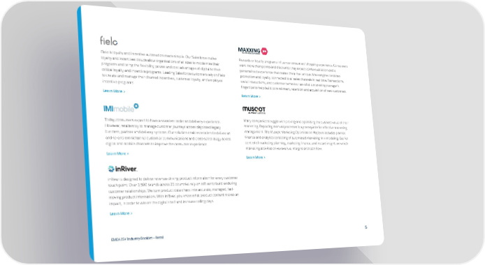 Fielo is loyalty and incentive automation made simple. Our Salesforce-native Rewards or loyalty programs influence consumers’ shopping experience. Consumers loyalty and incentives clouds allow organisations of all sizes to modernise their want more than points and discounts: they expect contextualisation and a programs and bring the flexibility, power and cost advantages of digital to their personalised experience that makes them feel unique. Maxxengine combines critical loyalty and incentive programs. Leading Salesforce customers rely on Fielo promotion and loyalty, connected to all sales channels in real time. Transactions, to create and manage their channel incentives, customer loyalty, and employee social interactions, and customer behaviour are all at a marketing manager’s incentive programs. fingertips to help build commitment, retention and acquisition of new customers. Learn More > Learn More > Today, consumers expect to have a seamless order and delivery experience. Many companies struggle with proving and optimising the business value of their However, retailers try to manage customer journeys across disjointed legacy marketing. Replacing manual processes is a prerequisite for effective marketing business, partner and delivery systems. Our solution enables retailers to deliver an management. The Musqot Marketing Optimisation Platform includes planner, end-to-end omnichannel customer communications and cross-sell strategy across finance and analytics consisting of automated marketing-mix-modeling. Get full digital and mobile channels to improve the consumer experience. control of marketing planning, marketing finance, and instant insights on which marketing activities drive revenue, margins and cash flow. Learn More > Learn More > inRiver is designed to deliver revenue-driving product information for every customer touch point. Over 1,500 brands across 21 countries rely on inRiver to build enduring customer relationships. We turn product data chaos into accurate, managed, fast- moving product information. With inRiver, you know what product content makes an impact, in order to win on the digital shelf and increase selling days. Learn More > EMEA ISV Industry Booklet — Retail 5