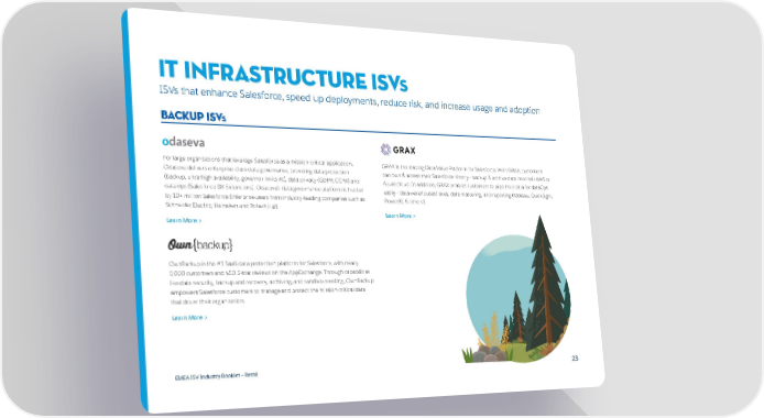 IT INFRASTRUCTURE ISVs ISVs that enhance Salesforce, speed up deployments, reduce risk, and increase usage and adoption backup ISVs For large organisations that leverage Salesforce as a mission-critical application, GRAX is the leading Data Value Platform for Salesforce. With GRAX, customers Odaseva delivers enterprise-class data governance, providing data protection can own & access their Salesforce history - backup & archive data into their AWS or (backup, ultra-high availability, governor limits AI), data privacy (GDPR, CCPA) and Azure cloud. In addition, GRAX enables customers to pipe their data for dataOps data ops (Salesforce DX Extensions). Odaseva’s data governance platform is trusted easily - data warehouses/lakes, data mastering, and reporting (Tableau, QuickSight, by 10+ million Salesforce Enterprise users from industry-leading companies such as PowerBI, & others). Schneider Electric, Heineken and Robert Half. Learn More > Learn More > OwnBackup is the #1 SaaS data protection platform for Salesforce, with nearly 5,000 customers and 450 5-star reviews on the AppExchange. Through capabilities like data security, backup and recovery, archiving, and sandbox seeding, OwnBackup empowers Salesforce customers to manage and protect the mission-critical data that drives their organisation. Learn More > EMEA ISV Industry Booklet — Retail 2233