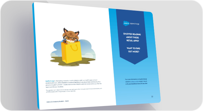 Enjoyed reading about these Retail apps? Want to find out more? AppExchange is the leading enterprise cloud marketplace with over 4,400 ready-to-install For more information on AppExchange solutions and over 1,800 consultants to extend Salesforce in any department and industry. It’s a solutions, drop us a line or get in touch proven ecosystem with 8M+ installs and more than 90,000 customer reviews to help you find the with your Salesforce Account Executive best match for your business. The apps featured in these booklets have been selected based on their strong use cases in the selected industries, and an EMEA presence with in-region support for our customers. EMEA ISV Industry Booklet – Retail 222222