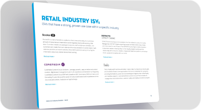 Retail Industry ISVs ISVs that have a strong, proven use case within a specific industry Booker25 is a native Salesforce application that allows scheduling of an unlimited DEFACTO is the leading solution provider in the field of direct-to-consumer Loyalty amount of resources and reservations and integrates directly with existing CRM Management. DEFACTO been supporting brands like HUGO BOSS, Orsay, Henkel data. Calendars include pre-packaged resources, staff and groups calendars, and and many more for over 30 years. The DEFACTO Loyalty Engine enables marketers customers can create their own calendars from any standard or custom object. Each to be more creative in the way they run their loyalty programs and shape their calendar provides an instant overview of availability and occupancy, including the relationship with consumers. Natively integrated in Salesforce platform, we leverage information about any related data to that booking. the full power of innovation with our clients. Find out more > Find out more > CoreMedia Content Cloud. Be Iconic. Leverage powerful, easy omnichannel content Fielo is loyalty and incentive automation made simple. Our Salesforce-native Loyalty creation, digital asset management and multi-experience orchestration by integrating and Incentives Clouds allow organisations of all sizes to modernise their programs CoreMedia Content Cloud DXP with Salesforce B2C Commerce, B2B Commerce, and and bring the flexibility, power and cost advantages of digital to their critical loyalty Marketing Clouds. Move at the speed of culture and create iconic experiences across and incentive programs. Leading Salesforce customers rely on Fielo to create and channels and devices. Available on AppExchange. manage their channel incentives, customer loyalty, and employee incentives program. Find out more > Find out more > EMEA ISV Industry Booklet – Retail 44