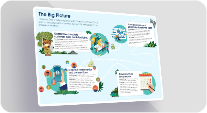 The Big Picture Revenue Grid is fully integrated with Financial Services Cloud Have accurate and and is uniquely customizable to the specific use cases in the complete data in the CRM. insurance industry. The Challenge: Insurance companies have to enhance customer service, optimize operational efficiency, and streamline agents’ productivity. To achieve these goals, they have to customize activity capture to Salesforce through specific workflow automation. Guarantee complete The Solution: Revenue Grid is fully customizable and allows customer data confidentiality. insurance companies to sync records to the correct accounts, accurately track communications, The Challenge: Insurance companies need to host all data-related apply role-based data quality software on premises or on private servers to ensure they meet filters, and more. their security and privacy requirements. The Solution: Revenue Grid can be deployed on premises or on a private server. There’s also an opportunity to deploy in a multitenant mode or a private tenant configuration to maintain data confidentiality. Map out relationships and connections. Avoid conflicts The Challenge: Limited visibility into account health and usage data results in missed expansion opportunities. in calendars. The Solution: Revenue Grid helps map out The Challenge: The problem of conflicting relationships and connections between people appointments with Lightning Scheduler. involved in accounts. Then it transforms client data into actionable insights so insurance agents can The Solution: Revenue Grid’s Lightning anticipate customer needs and deliver the Scheduler Adapter allows clients to book personalized recommendations they expect. meetings easier by automatically checking real-time availability in both Salesforce and Outlook calendars. The booked meetings will appear both in Salesforce and Outlook calendars.