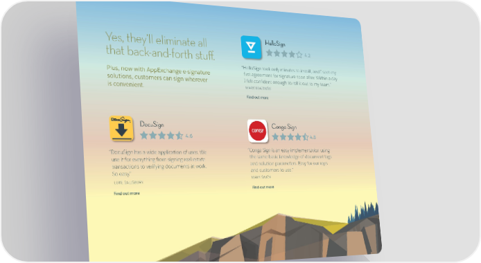 Yes, they’ll eliminate all HelloSign that back-and-forth stuff. 4.2 “ HelloSign took only minutes to install, and I sent my Plus, now with AppExchange e-signature first agreement for signature soon after. Within a day solutions, customers can sign wherever I felt confident enough to roll it out to my team.” is convenient. MARK BRAZINSKI Find out more DocuSign Conga Sign 4.6 4.8 “ DocuSign has a wide application of uses. We “ Conga Sign is an easy implementation using use it for everything from signing real estate the same basic knowledge of document tags transactions to verifying documents at work. and solution parameters. Easy for our reps So easy.” and customers to use.” LUKE SALISBURY MARK SINOR Find out more Find out more