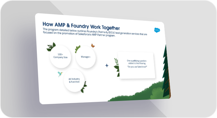 How AMP & Foundry Work Together The program detailed below outlines Foundry’s (formerly IDG’s) lead generation services that are focused on the promotion of Salesforce’s AMP Partner program. 100+ Manager+ Company Size One qualifying question added to the filtering “Do you use Salesforce?” + All Industry & Function