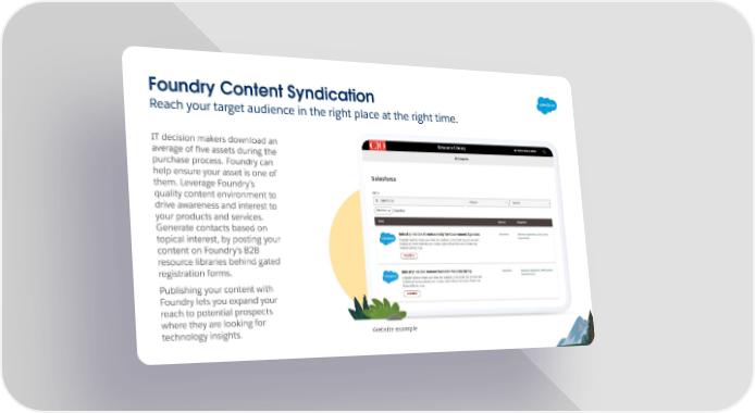 Foundry Content Syndication Reach your target audience in the right place at the right time. IT decision makers download an average of five assets during the purchase process. Foundry can help ensure your asset is one of them. Leverage Foundry’s quality content environment to drive awareness and interest to your products and services. Generate contacts based on topical interest, by posting your content on Foundry’s B2B resource libraries behind gated registration forms. Publishing your content with Foundry lets you expand your reach to potential prospects where they are looking for Website example technology insights.
