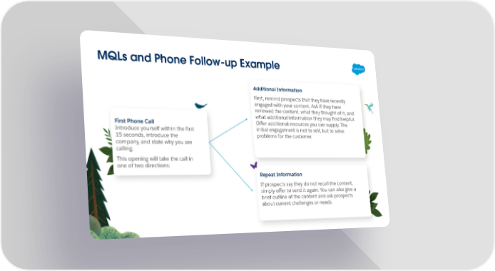 MQLs and Phone Follow-up Example Additional Information First, remind prospects that they have recently engaged with your content. Ask if they have reviewed the content, what they thought of it, and what additional information they may find helpful. Offer additional resources you can supply. The First Phone Call initial engagement is not to sell, but to solve Introduce yourself within the first problems for the customer. 15 seconds, introduce the company, and state why you are calling. This opening will take the call in one of two directions: Repeat Information If prospects say they do not recall the content, simply offer to send it again. You can also give a brief outline of the content and ask prospects about current challenges or needs.