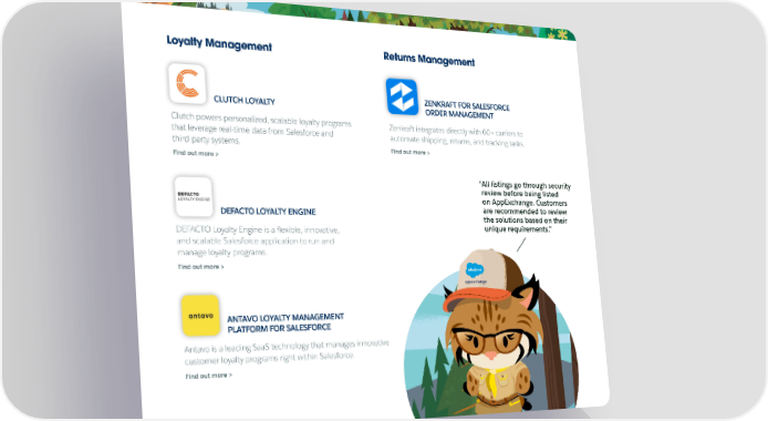 Loyalty Management Returns Management CLUTCH LOYALTY ZENKRAFT FOR SALESFORCE ORDER MANAGEMENT Clutch powers personalized, scalable loyalty programs Zenkraft integrates directly with 60+ carriers to that leverage real-time data from Salesforce and automate shipping, returns, and tracking tasks. third-party systems. Find out more > Find out more > “All listings go through security review before being listed on AppExchange. Customers DEFACTO LOYALTY ENGINE are recommended to review the solutions based on their DEFACTO Loyalty Engine is a lfexible, innovative, unique requirements.” and scalable Salesforce application to run and manage loyalty programs. Find out more > ANTAVO LOYALTY MANAGEMENT PLATFORM FOR SALESFORCE Antavo is a leading SaaS technology that manages innovative customer loyalty programs right within Salesforce. Find out more >
