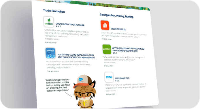 Trade Promotion Conifguration, Pricing, Quoting CPGTOOLBOX TRADE PLANNER ZILLIANT PRICE IQ 4.5 “ CPGToolBox took us from endless spreadsheets to Zilliant Price IQ uses AI to deliver customer-speciifc, optimized real-time info for planning, forecasting, deduction pricing for every product in every customer account. management, and more.” Find out more > POPCHIPS ADMIN Find out more > APTTUS CPQ (CONFIGURE PRICE QUOTE) FOR COMPLETE QUOTE-TO-CASH 5.0 ACCENTURE CLOUD RETAIL EXECUTION “ CPQ accelerated our quote and proposal management AND TRADE PROMOTION MANAGEMENT processes by eliminating repetitive tasks.” Accenture helps you plan and develop winning ABHINAV SHARMA campaigns with an overview of trade investments, Find out more > spending, and proiftability. Find out more > “AppExchange solutions PROS SMART CPQ can automate complex 4.6 tasks — letting you focus “ PROS Smart CPQ has signiifcantly reduced the time it on ensuring the best takes our sales teams to generate prices and quotes.” customer experience.” MARK HOEFING Find out more >