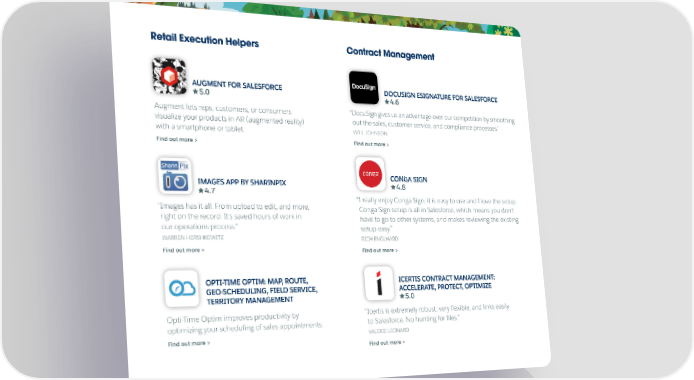 Retail Execution Helpers Contract Management AUGMENT FOR SALESFORCE DOCUSIGN ESIGNATURE FOR SALESFORCE 5.0 4.6 Augment lets reps, customers, or consumers “ DocuSign gives us an advantage over our competition by smoothing visualize your products in AR (augmented reality) out the sales, customer service, and compliance processes.” with a smartphone or tablet. WILL JOHNSON Find out more > Find out more > IMAGES APP BY SHARINPIX CONGA SIGN 4.7 4.8 “ I really enjoy Conga Sign; it is easy to use and I love the setup. “ Images has it all. From upload to edit, and more, Conga Sign setup is all in Salesforce, which means you don't right on the record. It's saved hours of work in have to go to other systems, and makes reviewing the existing our operations process.” setup easy.” WARREN HERSHKOWITZ RICH ENGLHARD Find out more > Find out more > OPTI-TIME OPTIM: MAP, ROUTE, ICERTIS CONTRACT MANAGEMENT: GEO-SCHEDULING, FIELD SERVICE, ACCELERATE, PROTECT, OPTIMIZE TERRITORY MANAGEMENT 5.0 Opti-Time Optim improves productivity by “ Icertis is extremely robust, very lfexible, and links easily optimizing your scheduling of sales appointments. to Salesforce. No hunting for ifles.” Find out more > VALERIE LEONARD Find out more >