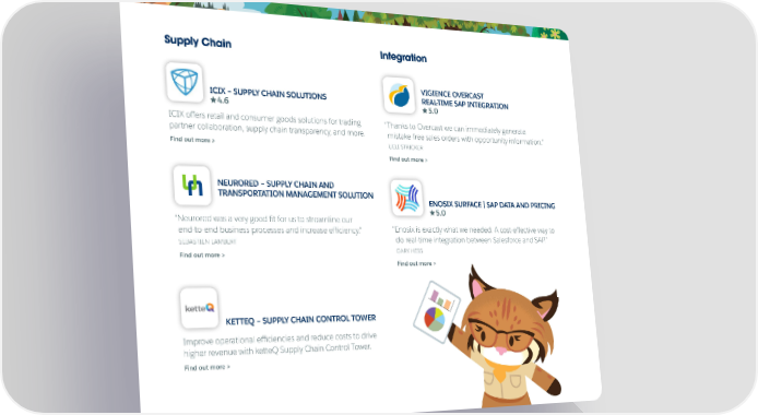 Supply Chain Integration VIGIENCE OVERCAST ICIX – SUPPLY CHAIN SOLUTIONS REAL-TIME SAP INTEGRATION 5.0 4.6 ICIX offers retail and consumer goods solutions for trading “ Thanks to Overcast we can immediately generate partner collaboration, supply chain transparency, and more. mistake-free sales orders with opportunity information.” Find out more > UELI STRICKER Find out more > NEURORED – SUPPLY CHAIN AND TRANSPORTATION MANAGEMENT SOLUTION ENOSIX SURFACE | SAP DATA AND PRICING 5.0 “ Neurored was a very good ift for us to streamline our end-to-end business processes and increase eiffciency.” “ Enosix is exactly what we needed. A cost-effective way to SEBASTIEN LAMBERT do real-time integration between Salesforce and SAP.” Find out more > GARY HESS Find out more > KETTEQ – SUPPLY CHAIN CONTROL TOWER Improve operational eiffciencies and reduce costs to drive higher revenue with ketteQ Supply Chain Control Tower. Find out more >