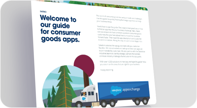INTRO The world of consumer goods has unique needs and challenges. Use this guide to quickly ifnd AppExchange apps that can help Welcome to your business thrive. Here’s how to use the guide: First, explore best practices on how our guide to ifnd an app that ifts your business challenge. Next, check out our answers to four common questions consumer goods for consumer customers like you have about how to move their business forward faster. Then read the app descriptions and customer goods apps. recommendations. Along the way, be sure to read Appy’s tips. Solutions selected for app guides start with you: customer favorites. We look at reviews and ratings to make sure apps are recommended by customers. We also partner with the Salesforce industries teams to identify strategic partners that address common industry challenges for inclusion in the app guide. With over 4,000 solutions in inventory, we hope this guide helps you zero in on the ones that are right for your business. Happy exploring.