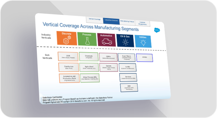 Vertical Coverage Subvertical Solutions Manufacturing Product Customer Engagements Vertical Coverage Across Manufacturing Segments Discrete Process Automotive Oil & Gas Utilities Industry Verticals Super Majors Sub Chemicals OEM OEM’s Utilities (Integrated Energy (Integrated) (Heavy Equip / Assets) (Vehicle Manufacturers) Companies) Verticals Dealers Distribution Agricultural Up-Mid (Dealers, Dealer Groups, (Spec Parts) (feeds, herbicides, etc.) (Upstream and Midstream) NSC’s) Automotive and Other Process Mfg Services Production Parts (Raw Materials / Smelting, etc.) (Oilfield Services and OEMs) (Engineered Parts) DED (Distribution, EPCI, Downstream) Salesforce Confidential Materials provided as a Program Benefit as that term is defined in the Salesforce Partner Program Agreement ℗Copyright 2019 Salesforce.com, inc. All rights reserved.