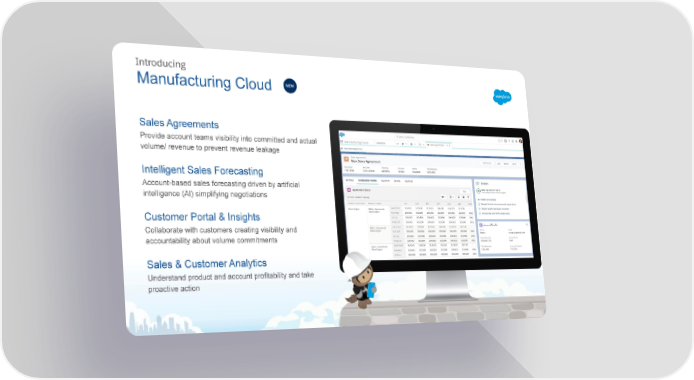 Introducing NEW Manufacturing Cloud Sales Agreements Provide account teams visibility into committed and actual volume/ revenue to prevent revenue leakage Intelligent Sales Forecasting Account-based sales forecasting driven by artificial intelligence (AI) simplifying negotiations Customer Portal & Insights Collaborate with customers creating visibility and accountability about volume commitments Sales & Customer Analytics Understand product and account profitability and take proactive action