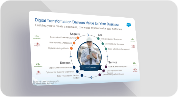 Digital Transformation Delivers Value for Your Business Enabling you to create a seamless, connected experience for your customers Acquire Sell +6% +9% Personalized Customer Journeys Sales and Quoting Management products revenue margin expansion B2B Marketing Engagement Expanded Digital Commerce -15% -15% marketing costs R&D costs Digital Marketing at Scale Dealer & Distributor Management Deepen Service +3% +4% experiences revenue parts revenue Deploy Data-Driven Services Contact Center Management YYour Customerour Customer -8% -30% Optimize the Customer Experience Grow Aftermarket Parts SG&A costs field force cost Revenue Tailor Products and Services Deliver Intelligent Field Service Portfolio Source: “The Trillion Dollar Opportunity for the Industrial Sector”, McKinsey & Co., 2018