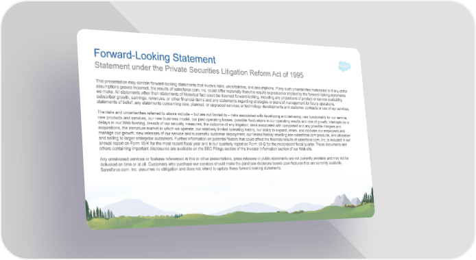 Forward-Looking Statement Statement under the Private Securities Litigation Reform Act of 1995 This presentation may contain forward-looking statements that involve risks, uncertainties, and assumptions. If any such uncertainties materialize or if any of the assumptions proves incorrect, the results of salesforce.com, inc. could differ materially from the results expressed or implied by the forward-looking statements we make. All statements other than statements of historical fact could be deemed forward-looking, including any projections of product or service availability, subscriber growth, earnings, revenues, or other financial items and any statements regarding strategies or plans of management for future operations, statements of belief, any statements concerning new, planned, or upgraded services or technology developments and customer contracts or use of our services. The risks and uncertainties referred to above include – but are not limited to – risks associated with developing and delivering new functionality for our service, new products and services, our new business model, our past operating losses, possible fluctuations in our operating results and rate of growth, interruptions or delays in our Web hosting, breach of our security measures, the outcome of any litigation, risks associated with completed and any possible mergers and acquisitions, the immature market in which we operate, our relatively limited operating history, our ability to expand, retain, and motivate our employees and manage our growth, new releases of our service and successful customer deployment, our limited history reselling non-salesforce.com products, and utilization and selling to larger enterprise customers. Further information on potential factors that could affect the financial results of salesforce.com, inc. is included in our annual report on Form 10-K for the most recent fiscal year and in our quarterly report on Form 10-Q for the most recent fiscal quarter. These documents and others containing important disclosures are available on the SEC Filings section of the Investor Information section of our Web site. Any unreleased services or features referenced in this or other presentations, press releases or public statements are not currently available and may not be delivered on time or at all. Customers who purchase our services should make the purchase decisions based upon features that are currently available. Salesforce.com, inc. assumes no obligation and does not intend to update these forward-looking statements.