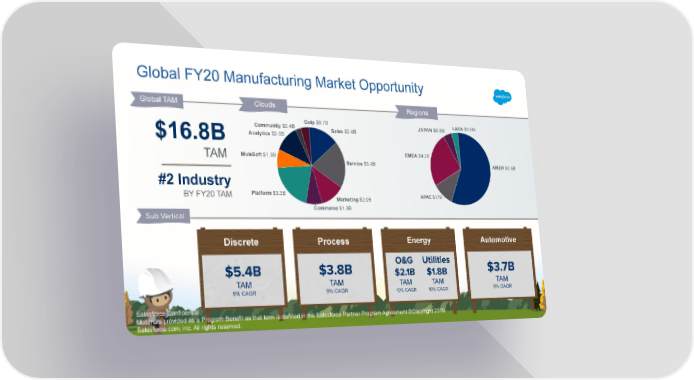 Global FY20 Manufacturing Market Opportunity Global TAM Clouds Regions Quip $0.7B LACA $0.6M JAPAN $0.8M Community $0.4B Sales $2.4B Analytics $2.0B $16.8B EMEA $4.2B MuleSoft $1.3B TAM Service $3.4B AMER $9.5B #2 Industry Platform $3.3B BY FY20 TAM APAC $1.7B Marketing $2.0B Commerce $1.3B Sub Vertical Energy Automotive Discrete Process O&G Utilities $5.4B $3.8B $3.7B $2.1B $1.8B TAM TAM TAM TAM TAM 9% CAGR 9% CAGR 9% CAGR 10% CAGR 10% CAGR Salesforce Confidential Materials provided as a Program Benefit as that term is defined in the Salesforce Partner Program Agreement ℗Copyright 2019 Salesforce.com, inc. All rights reserved.