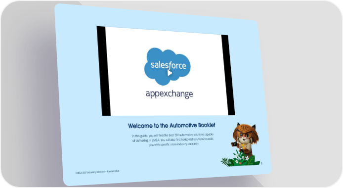 Salesforce ISV Industry Booklet - Automotive Page 1 Page 3Video Player is loading.Play VideoPlaySkip BackwardSkip ForwardMuteCurrent Time 0:00/Duration 0:51Loaded: 4.54%0:00Stream Type LIVESeek to live, currently behind liveLIVERemaining Time -0:51 1xPlayback RateChaptersChaptersDescriptionsdescriptions off, selectedCaptionscaptions settings, opens captions settings dialogcaptions off, selectedAudio TrackPicture-in-PictureFullscreenThis is a modal window.Beginning of dialog window. Escape will cancel and close the window.TextColorWhiteBlackRedGreenBlueYellowMagentaCyanOpacityOpaqueSemi-TransparentText BackgroundColorBlackWhiteRedGreenBlueYellowMagentaCyanOpacityOpaqueSemi-TransparentTransparentCaption Area BackgroundColorBlackWhiteRedGreenBlueYellowMagentaCyanOpacityTransparentSemi-TransparentOpaqueFont Size50%75%100%125%150%175%200%300%400%Text Edge StyleNoneRaisedDepressedUniformDrop shadowFont FamilyProportional Sans-SerifMonospace Sans-SerifProportional SerifMonospace SerifCasualScriptSmall CapsResetDoneClose Modal DialogEnd of dialog window.
