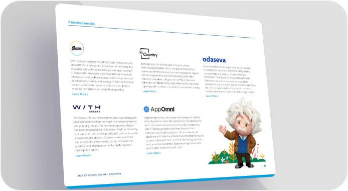 IT Infrastructure ISVs Own protects mission-critical SaaS data for hundreds of Store & process Salesforce data in more countries, Odaseva delivers the strongest data security solution products that allow you to: 1) Recover: Protect data and while staying compliant. InCountry provides Salesforce for enterprises running on Salesforce, safeguarding metadata with automated backups and rapid recovery. customers with the tools and controls necessary to expand confidentiality and integrity of critical business 2) Accelerate: Propagate data to sandboxes for quicker into new regions and countries requiring greater data information. The Odaseva Enterprise Data Security innovation and establish anonymised environments for residency compliance. Migrate to new Hyperforce and Platform ensures business continuity, regulatory development, testing, and training. 3) Archive: Preserve Salesforce on Alibaba Cloud orgs while maintaining global compliance, and protection against threats to Salesforce data in archives with customisable retention policies, reporting with real-time, anonymised cross-border syncing. data. It is designed and built specifically to solve the ensuring compliance and simplified reporting. Learn More > complex challenges of large-scale global organisations. Learn More > Learn More > WithSecure™ Cloud Protection for Salesforce safeguards AppOmni provides continuous monitoring and visibility your Salesforce environment against advanced malware of configurations, activities, permissions and data access and phishing threats. The natively integrated solution within Salesforce environments. Security, Compliance, has been developed with Salesforce. Deployed instantly, and IT teams can detect real-time threats in their it ensures safe and undisrupted digital services for public Salesforce and SaaS ecosystem. The combination of ecosystems and citizens. Comprehensively certified AppOmni with Salesforce Shield Event Monitoring equips and reviewed solution meets the high standards for security teams with tools to effectively manage security sensitive data management in the highly targeted posture across Salesforce. Stop misconfigurations and digital public sphere. preventable mistakes by end users. Learn More > Learn More > EMEA ISV Industry Booklet — Automotive 21