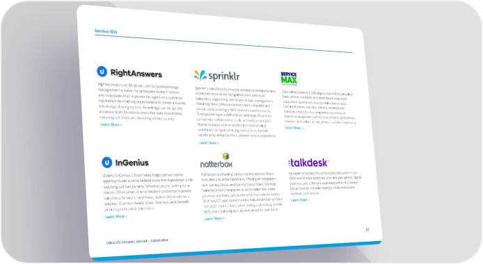 Service ISVs RightAnswers is an AI-driven, connected knowledge Sprinklr’s Salesforce Connector provides a comprehensive ServiceMax delivers a 360-degree view into the installed management solution for enterprise contact centres social care experience for Sprinklr users directly in base, service contracts, and asset data to maximise and help desks that improves the agent and customer Salesforce, supporting omnichannel case management. equipment uptime and reduce maintenance costs. experience by enabling organisations to create a trusted This integration offers a seamless blend of public and Our asset-centric solution, natively developed for knowledge sharing culture. Knowledge can be quickly private data, creating a 360° view of customer needs. Salesforce Field Service, empowers customers to accessed from Salesforce and other data repositories, It empowers agents with unified desktops, AI bots for maximise equipment uptime, reduce costs, grow service reducing call times and boosting service quality. self-service, collaboration tools, and unified analytics. revenue, and deliver an exceptional customer experience. Learn More > By improving customer satisfaction, streamlining Learn More > workflows, and personalising interactions, Sprinklr significantly enhances the customer service experience. Learn More > Upland InGenius CTI software helps contact centre Natterbox is a leading contact centre solution that’s Talkdesk for Service Cloud Voice provides an all-in-one agents provide a personalised customer experience while exclusively built for Salesforce, offering an integration CRM and contact centre solution that joins phone, digital reducing call handle time. Whether you’re looking for a with Service Cloud and Service Cloud Voice. We help channels, and CRM data seamlessly within the Service classic CTI solution or an enterprise connector to power Salesforce-first companies to personalise their caller Cloud console. All while relying on fully embedded Salesforce Service Cloud Voice, Upland InGenius has a journeys and boost productivity for their service teams. Talkdesk functionality. solution. Connect Avaya, Cisco, Genesys, and Asterisk With key CTI and contact centre features including Voice, Learn More > phone systems with Salesforce. IVR, ACD, click-to-dial, call recording, call routing, mobile, Learn More > SMS, voice transcription, speech analytics, and dialer. Learn More > EMEA ISV Industry Booklet — Automotive 11
