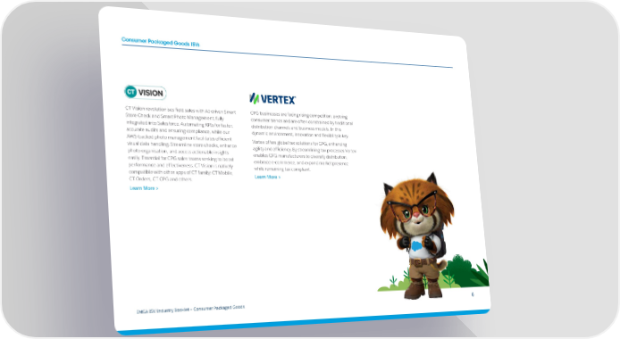 Consumer Packaged Goods ISVs CT Vision revolutionises field sales with AI-driven Smart CPG businesses are facing rising competition, evolving Store Check and Smart Photo Management, fully consumer trends and are often constrained by traditional integrated into Salesforce. Automating KPIs for faster, distribution channels and business models. In this accurate audits and ensuring compliance, while our dynamic environment, innovation and flexibility is key. AWS-backed photo management facilitates efficient Vertex offers global tax solutions for CPG, enhancing visual data handling. Streamline store checks, enhance agility and efficiency. By streamlining tax processes Vertex photo organisation, and access actionable insights enables CPG manufacturers to diversify distribution, easily. Essential for CPG sales teams seeking to boost embrace e-commerce, and expand market presence performance and effectiveness. CT Vision is natively while remaining tax compliant. compatible with other apps of CT family: CT Mobile, Learn More > CT Orders, CT CPG and others. Learn More > EMEA ISV Industry Booklet — Consumer Packaged Goods 6