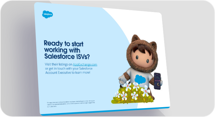 Ready to start working with Salesforce ISVs? Visit their listings on AppExchange.com or get in touch with your Salesforce Account Executive to learn more! The apps featured in these booklets have been selected based on their strong use cases in the selected industries, and an EMEA presence with in-region support for our customers.