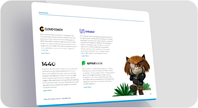 Service ISVs Cloud Coach is the go-to solution for enterprise-class With Unbabel’s AI-powered language operations platform, Customer Onboarding & Success, Professional Services all support agents instantly become multilingual, fostering Automation (PSA), and Project Portfolio Management meaningful customer relationships worldwide. Seamlessly (PPM). Built 100% natively on Salesforce, Cloud Coach integrating with Salesforce, Unbabel removes language provides an all-in-one platform for professional services barriers, combining machine translation and human organisations to visualise their full customer journey and expertise for real-time, multilingual conversations. ensure profitable customers from contract-signature Enhance global customer experiences, boost agent to renewal. productivity, and reduce costs, ensuring consistent, Learn More > high-quality support across all digital channels. Learn More > Reputation Studio by 1440 revolutionises omnichannel Sprout Social is a social media management solution, customer review and Q&A management for Service blendsing social data with Salesforce C360 so brands Cloud users in EMEA. Our native solution seamlessly can optimise every touchpoint. With a unified codebase, integrates with Salesforce Service Cloud to centralise Sprout offers rapid innovation and time-to-value. brand responses, prioritise cases, and gain valuable Integrations across Service, Marketing, Sales, Slack, insights. With real-time alerts and performance tracking, and Tableau deliver comprehensive, world-class social we help brands elevate customer satisfaction and brand engagement and enable cross-team collaboration – reputation across channels like Google My Business, all within Salesforce. Trustpilot, and more. Learn More > Learn More > EMEA ISV Industry Booklet — Manufacturing 11